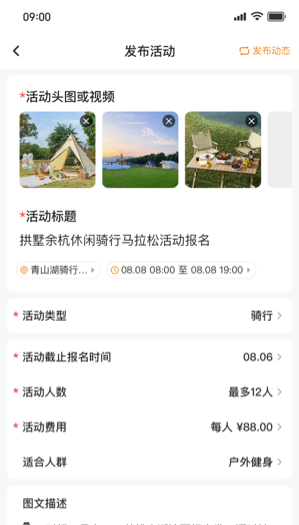 允许用户根据自身需求,在平台上创建并发布各种活动,如线上讲座、线下聚会、展览、比赛等。用户可以通过该功能填写活动的详细信息,包括活动名称、时间、地点、参与人数、活动介绍、活动海报等,以便其他用户了解并参与。